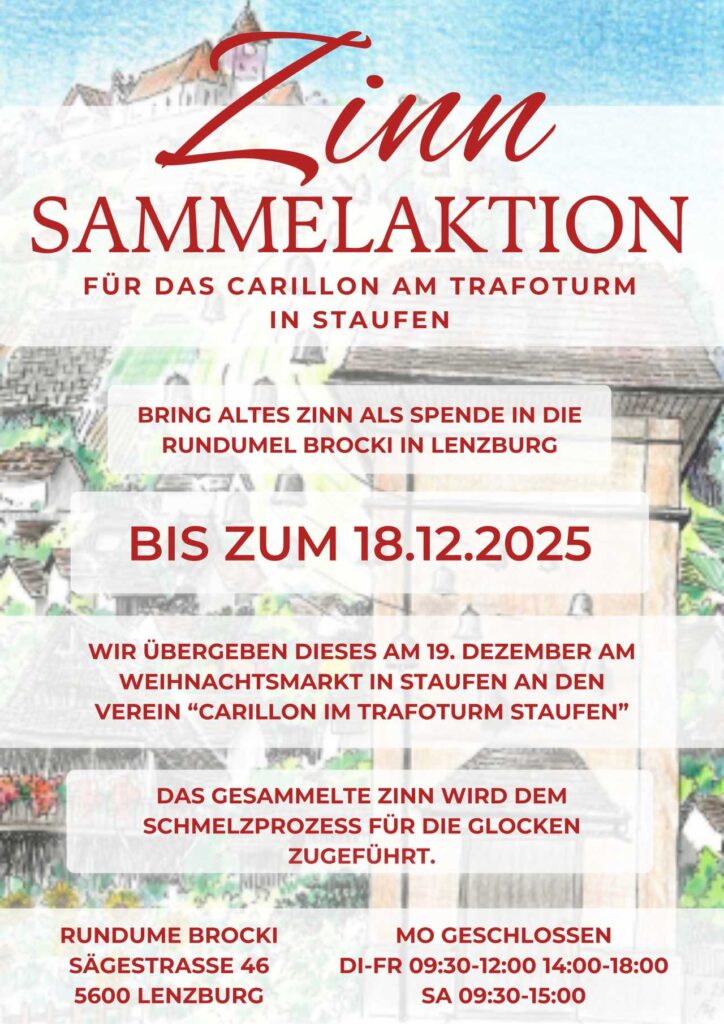 Wir freuen uns sehr über die Unterstützung der Brocki Rundumel. Die Brocki, die sich auf dem Wisa Gloria Areal an der Sagestrasse 46 in Lenzburg befindet, hat einen Aufruf gemacht, alte Zinnsachen in der Brocki vorbeizubringen.