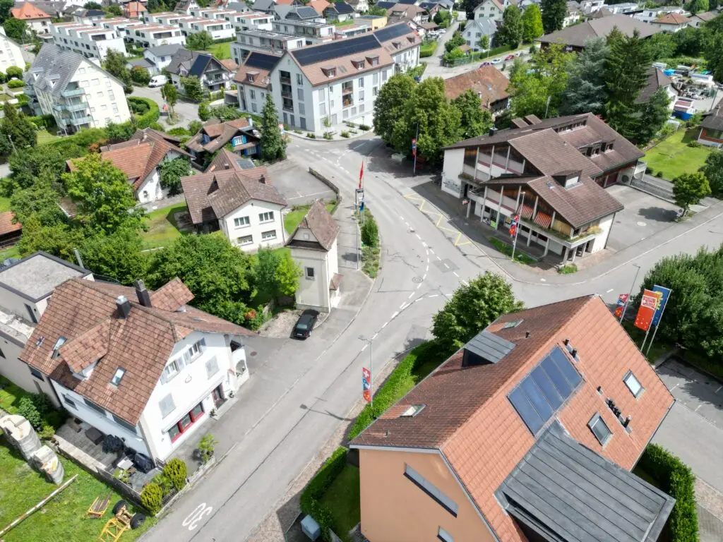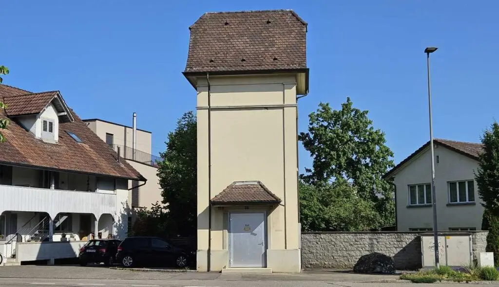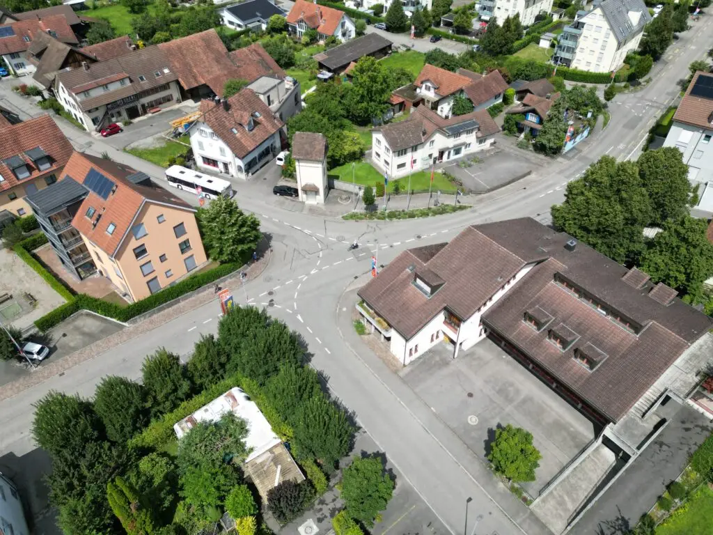 Der Lindenplatz im Zentrum von Staufen mit dem Trafoturm. Nebendran die Bäckerei Gradwohl. In unmittelbarer Umgebung der VOLG-Laden und das Restaurant zur Linde. Beim Mehrzweckgebäude der Gemeinde befinden sich die Bushaltestellen sowie ein öffentliches WC.