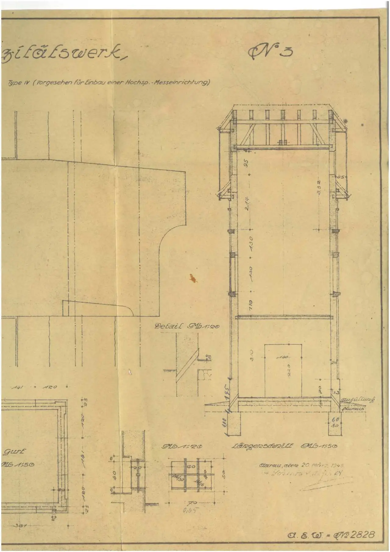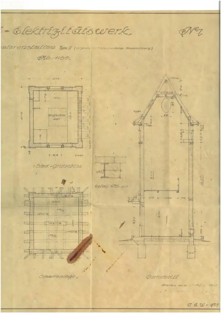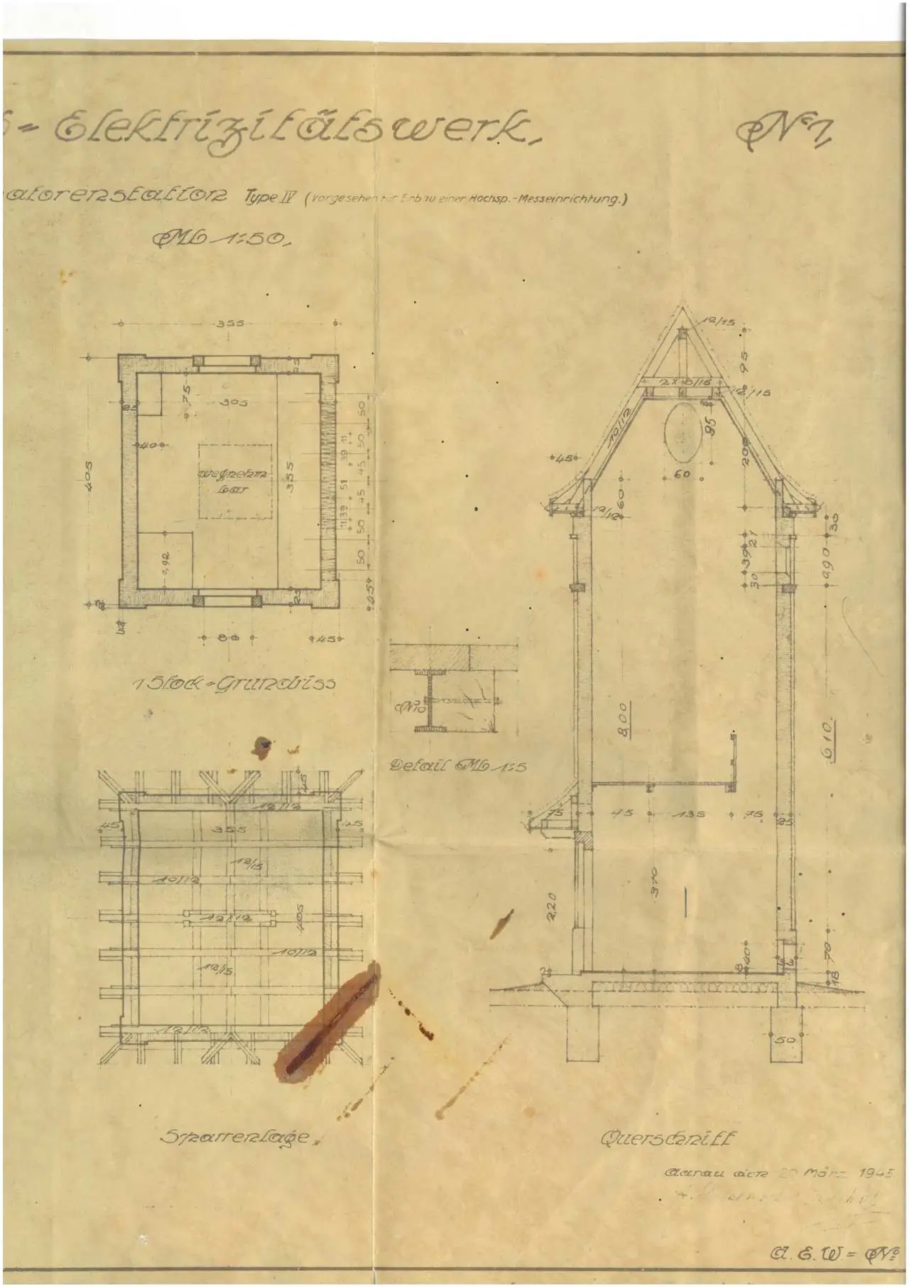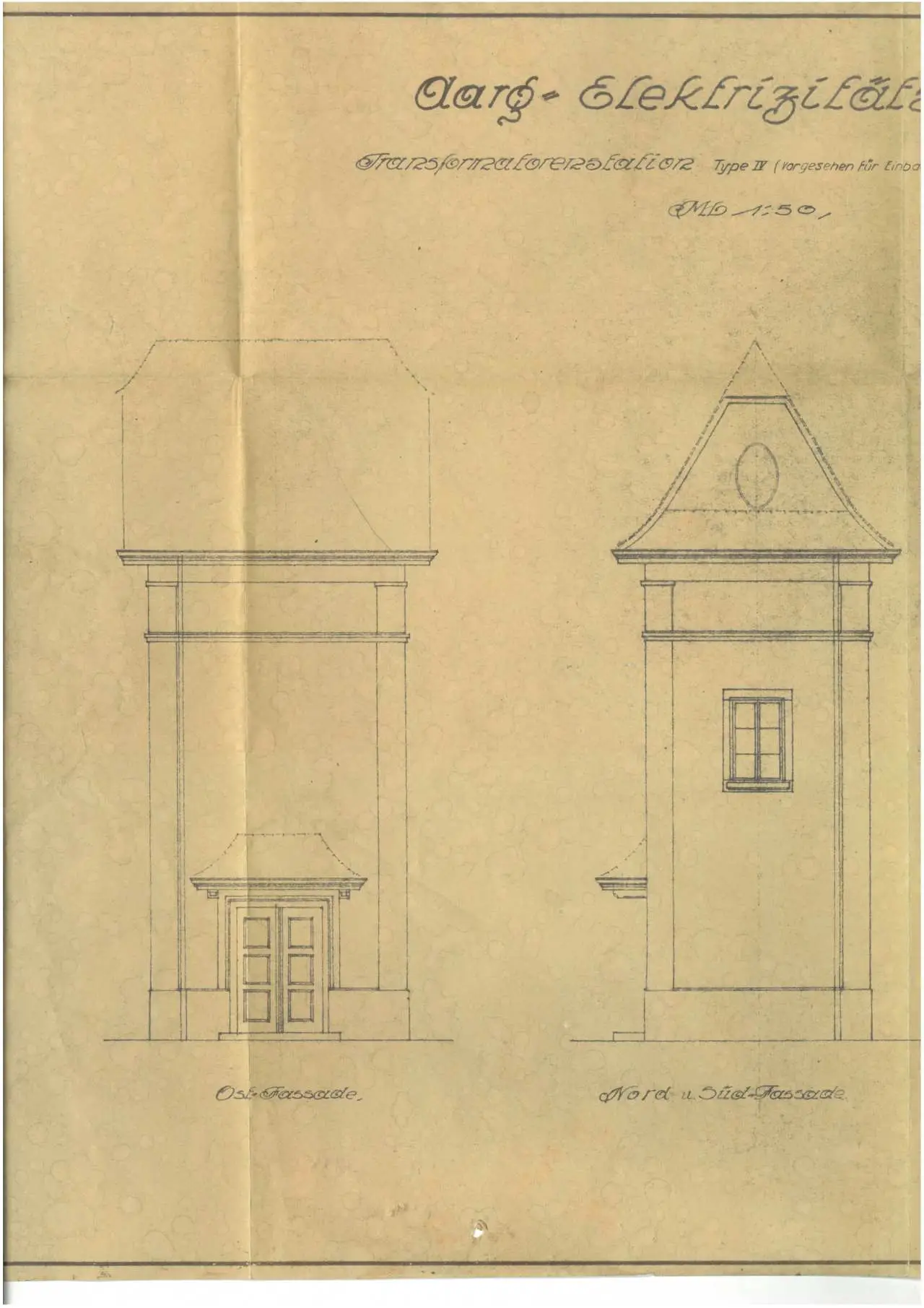 Der Trafoturm am Lindenplatz wurde 1945 erbaut. Es war das erste öffentliche Bauwerk von Baumeister Plinio Doninelli. Die von Hand gezeichneten Baupläne sind erhalten geblieben und geben so ein Zeugnis vom Bau, der die Elektrifizierung in Staufen einläutete.