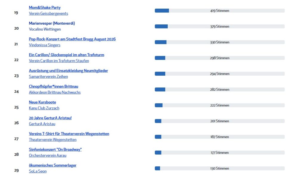 Es hat nicht ganz gereicht für einen Siegerplatz. Trotzdem danken wir allen fast 300 Stimmen, die für das Carillon amTrafoturm gevotet haben. Und wir sind überzeugt, dass wir mit der Teilnahme am AEW-Energiebatzen den Bekanntheitsgrad der Projektidee vergrössert haben.