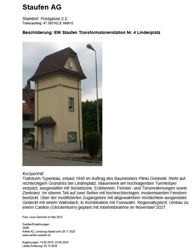 Die Dokumentation für die Trafostation für Staufen sieht folgedermassen aus: